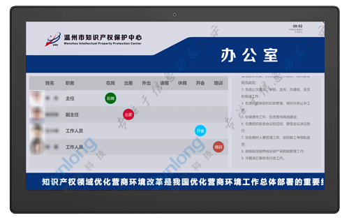 • 直观展示:公示屏采用绿色化、数字化的设计,以清晰、直观的方式展示人员动态,便于来中心办事的人员了解工作人员状态和同事之间快速了解彼此的工作状态。