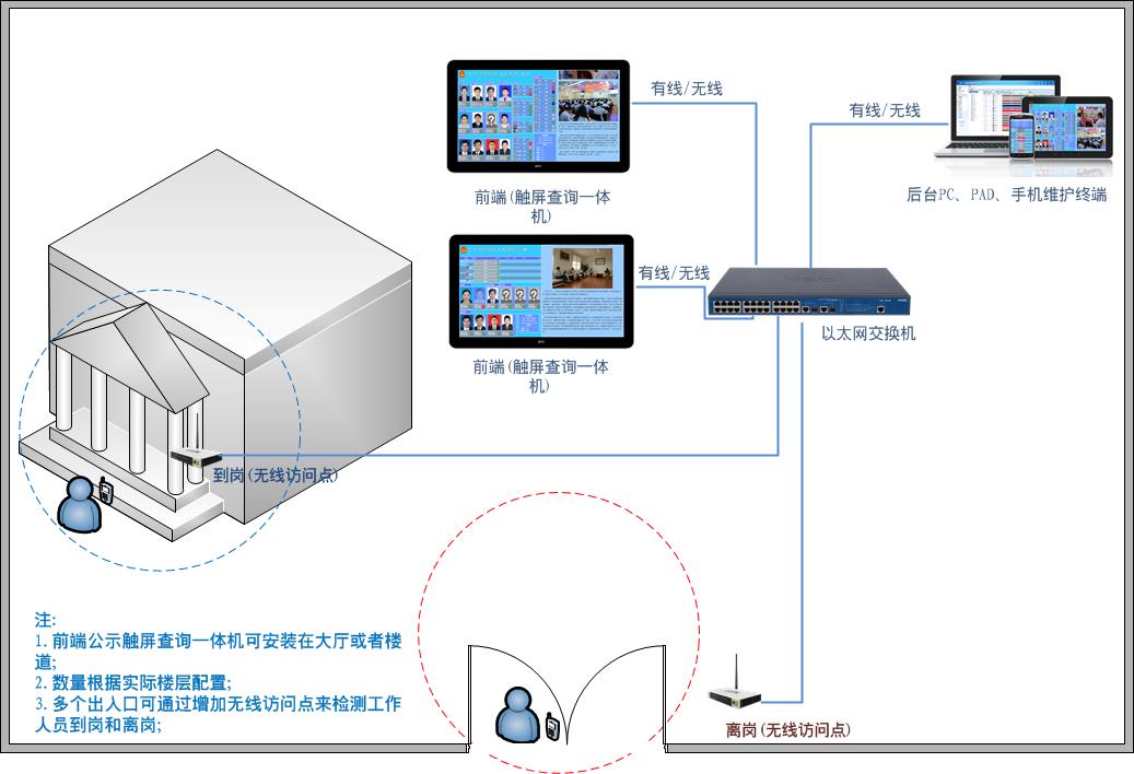 电子人员去向公示牌借助手机(PC)实现人员去向牌与人员去向一致,在单位出入口处安装Wifi路由器来检测进出单位工作人员的手机联网状态或由办公区域的路由器检测工作人员PC机联网状态,当工作人员进入单位时电子人员去向公示牌自动将人员公示状态更新为在位,当工作人员离开单位时电子人员去向公示牌自动将状态更新为离开,同时后台可以提醒管理人员xx工作人员离开,管理人员可通过电话提醒工作人员自己更新实际去向公示如“学习”、“培训”等或由管理人员更新。能有效避免人工更新工作人员去向状态不及时造成人员去向牌与人员去向不一致的现象,同时也减轻了工作人员的工作量,切实发挥好“人员去向指示牌”的告知作用。