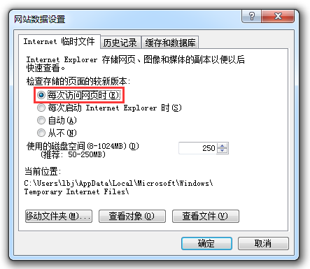 1.在【Internet临时文件】选项卡设置检查存储的页面的较新版本为{每次访问网页时}。